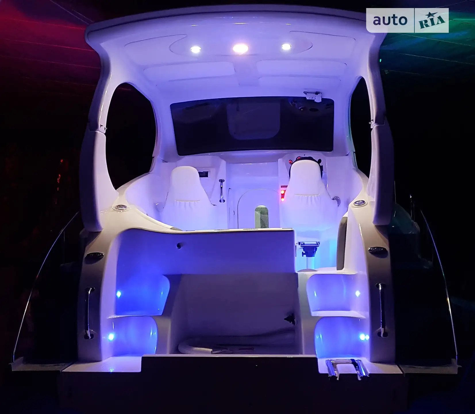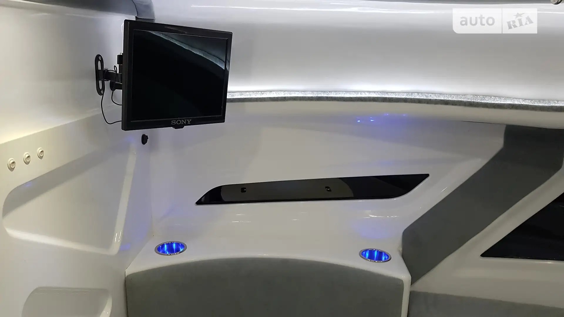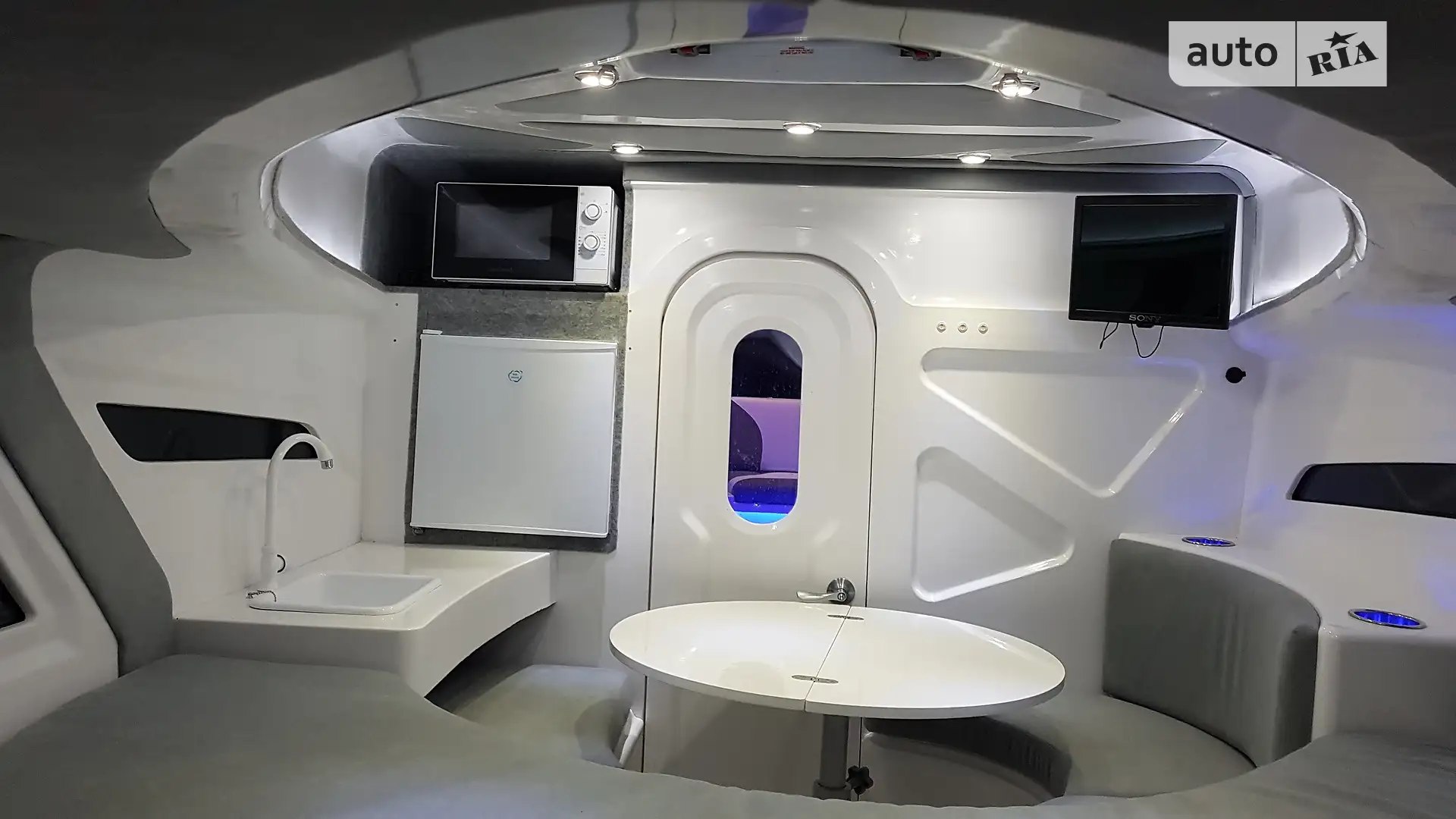 Salon and comfort: hatch, tinted windows, decorative salon lighting, 220V and 12V outlets, refrigerator.